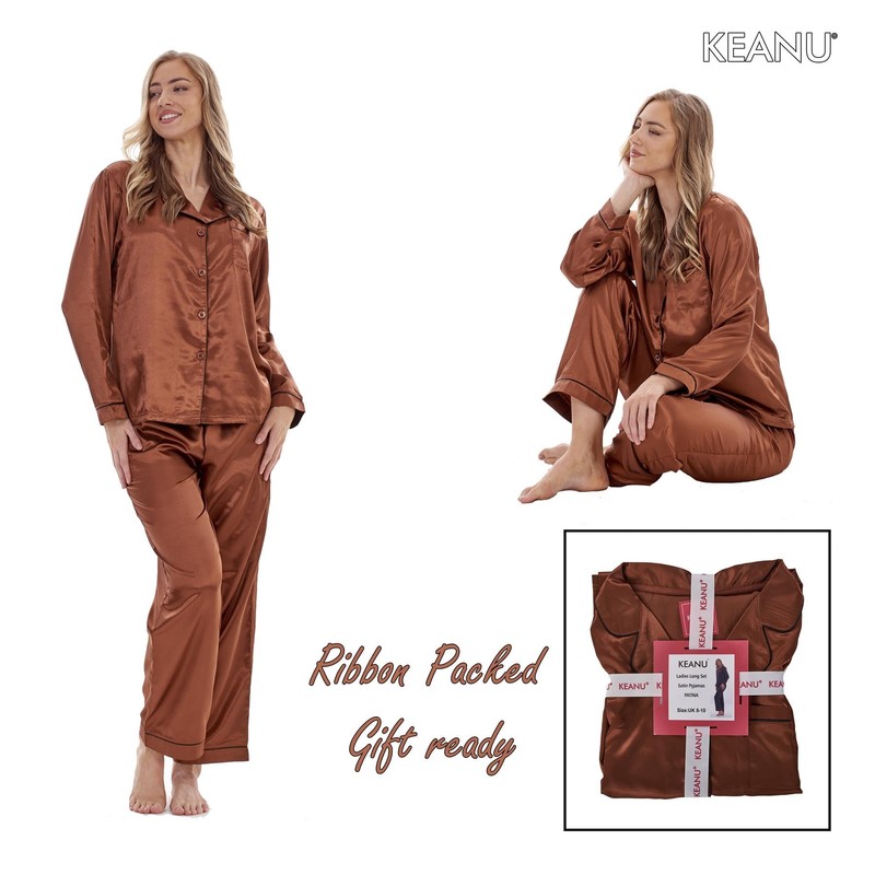 - LADIES SATIN PJs: Wrap yourself in sophistication and style with our Ladies Satin Pyjamas by Keanu. These long sleeve and long bottom pyjamas redefine relaxation. The contrasting piping details provide a chic touch, and the button-front top with a chest pocket adds practicality to your bedtime routine. Designed with an elasticated waist for comfort, these pyjamas are your perfect companion for a cozy night's sleep