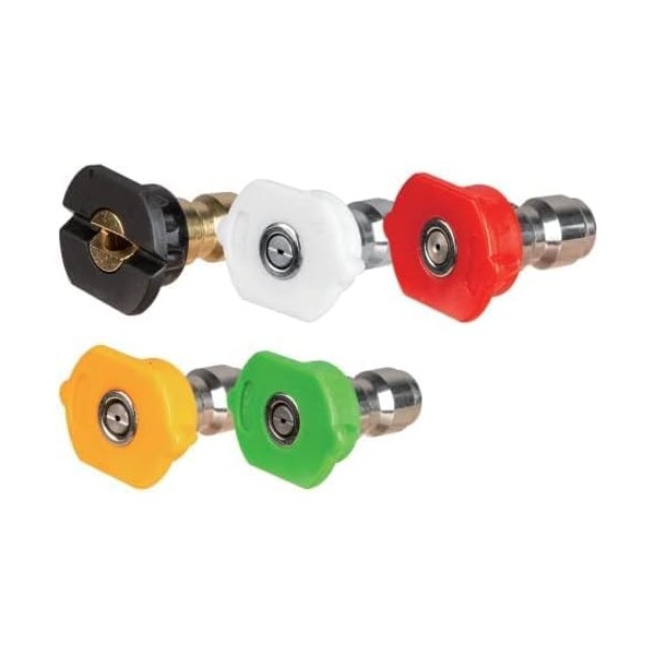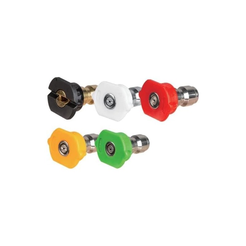 - The nozzle tip set includes: 1 red stainless steel nozzle tip (0 degrees), 1 yellow stainless steel nozzle tip (15 degrees), 1 green stainless steel nozzle tip (25 degrees), 1 white stainless steel nozzle tip (40 degrees), and 1 brass soap nozzle tip (65 degrees).