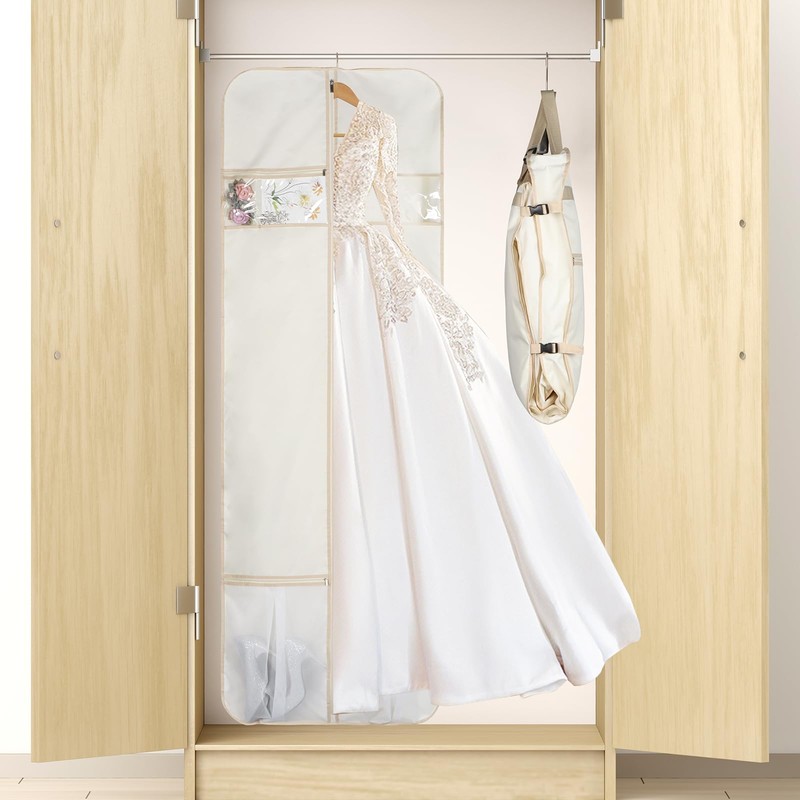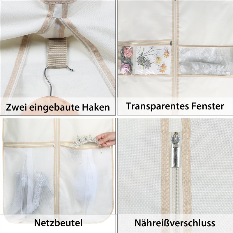 • STRONGER ZIPPER & TRANSPARENT WINDOW The metal zipper of the wedding dress bag is reinforced with double crimping lines for more stability, and the transparent window on the front of the bag allows you to see what clothes are inside without having to open the bag. Make your life easier.