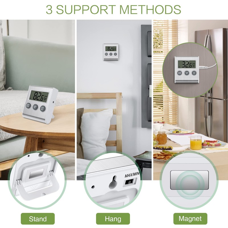• EASY TO OPERATE: Put probe into freezer to measure temperature (Put probe only, do not put thermometer) You can easily change the installation position according to your needs by 3 installation methods: upright, suspended, and magnetic