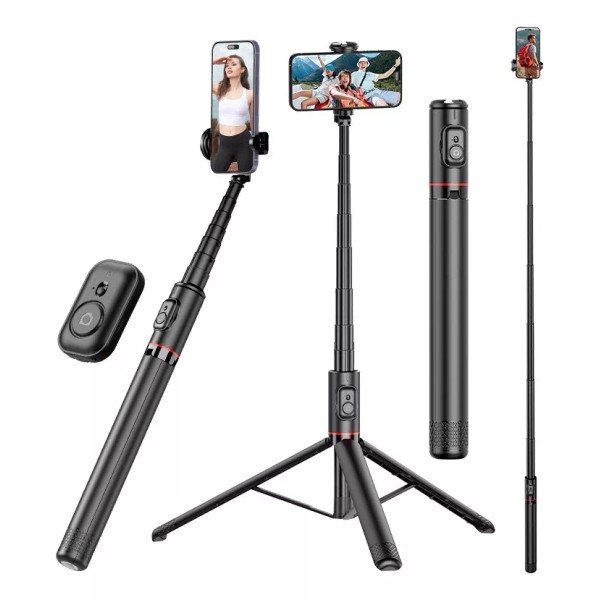 1. Trípode para teléfono móvil integrado: el trípode para selfies es multifuncional y ajustable. No solo se puede utilizar como un trípode liviano para teléfono móvil cuando viaja, sino también como soporte para teléfono móvil para grabar videos durante una transmisión en vivo, o como un trípode-palo para selfies con control remoto al tomar fotos familiares. Proporcione los mejores efectos fotográficos para aplicaciones de múltiples escenas.