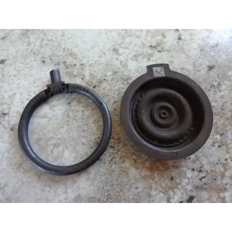 This listing is for a set of 2 new older stock Keeler Brass two part back and bail pulls. Arts and crafts style round swing/ring pull with backplate. Made of metal. Overall measurements: Back plate and ring are 2-1/8" diameter. They would project 3/8".