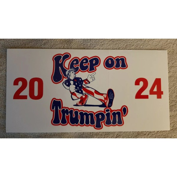 KEEP ON TRUMPIN'  2024 bumper sticker. 7 1/2 x 3 3/4 inches. Made in USA. Sent USPS First Class
