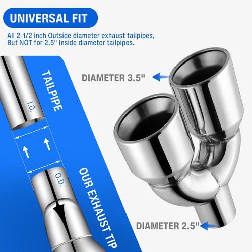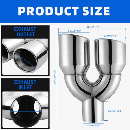 SIZE: Standard exhaust tip size 2.5" inlet 3.5" outlet 9.5" overall length,please measure of your tailpipe before purchasing