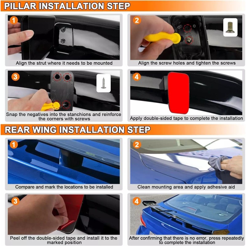 【Easy installation method】The rear spoiler wing is easy to install. We provide screws and adhesive tape, allowing you to install it without drilling holes in your car. If you install it with adhesive tape, we suggest you use a hair drier to heat the double-sided adhesive will be better.