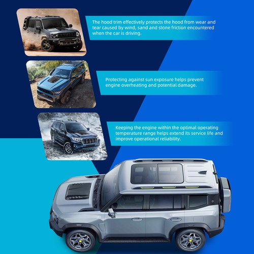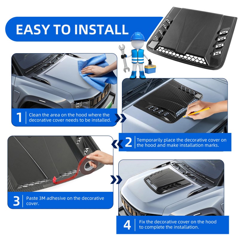 Install: Easy installation by sticking it on your car hood, using the vent cover hood to give your car appearance more eye-catching and particularly cool.