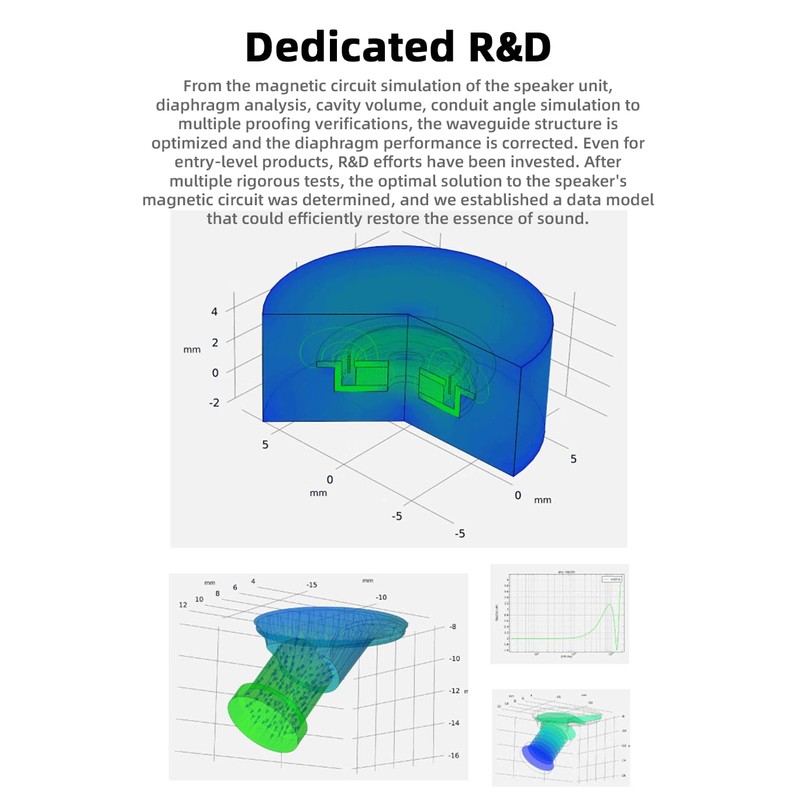 - R&D: Based on the simulation of the magnetic circuit of the analysis of the membrane of the speaker unit, the volume of the cavity, the simulation of the channel angle during multiple tests, the structure of the waveguide is optimized and the performance of the membrane is corrected.