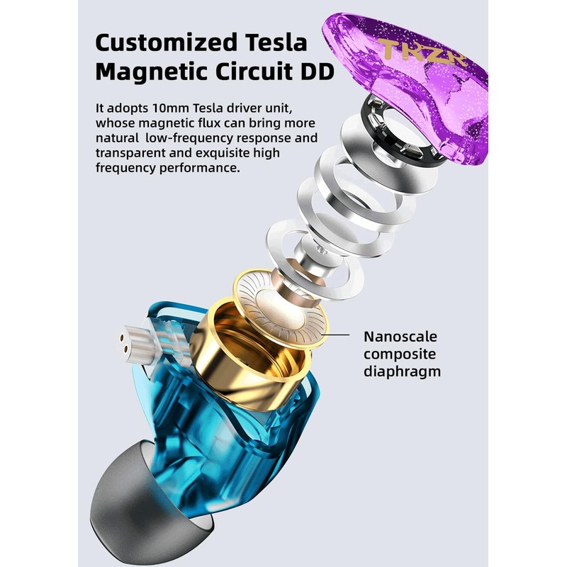 - Tesla magnetic circuit DD: it adopts 10mm Tesla driver unit, whose magnetic flux can provide a more natural low frequency response and transparent and exquisite high frequency performance.