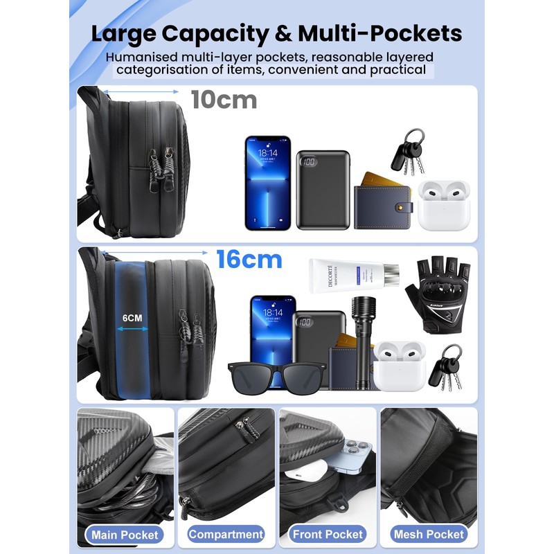 - Thoughtful layout & generous storage space: our waist bag impresses with an intelligent compartment system that allows clear organisation. Smartphone, keys, wallet and other accessories always find their place thanks to practical details such as internal key holder and external headphone compartment. In addition, the motorcycle bag has an expandable storage area of 6 cm, ideal for anyone who appreciates order and quick access.