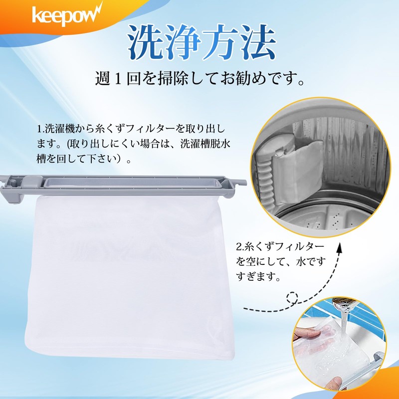 - 【使用上の注意点】洗濯物をきれいに保つために、洗濯機の使用頻度によって、洗濯機の糸くずフィルターは、少なくとも1週間を目安に定期的に洗濯してください。洗い方: (1) 洗濯機から糸くずフィルターを取り出します。(取り出しにくい場合は、洗濯槽脱水槽を回して下さい)。 (2) 糸くずフィルターを空にして、水ですすぎます。 (3) 糸くずフィルターを洗濯機にセットします。