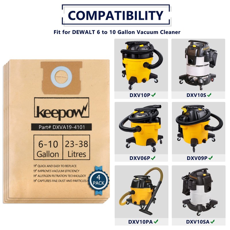 KEEPOW Shop Vac Bags Compatible with Dewalt 6 to 10 Gallon Vacuum DXV06P, DXV09P, DXV10P, DXV10S, 4 Pack, Part# DXVA19-4101