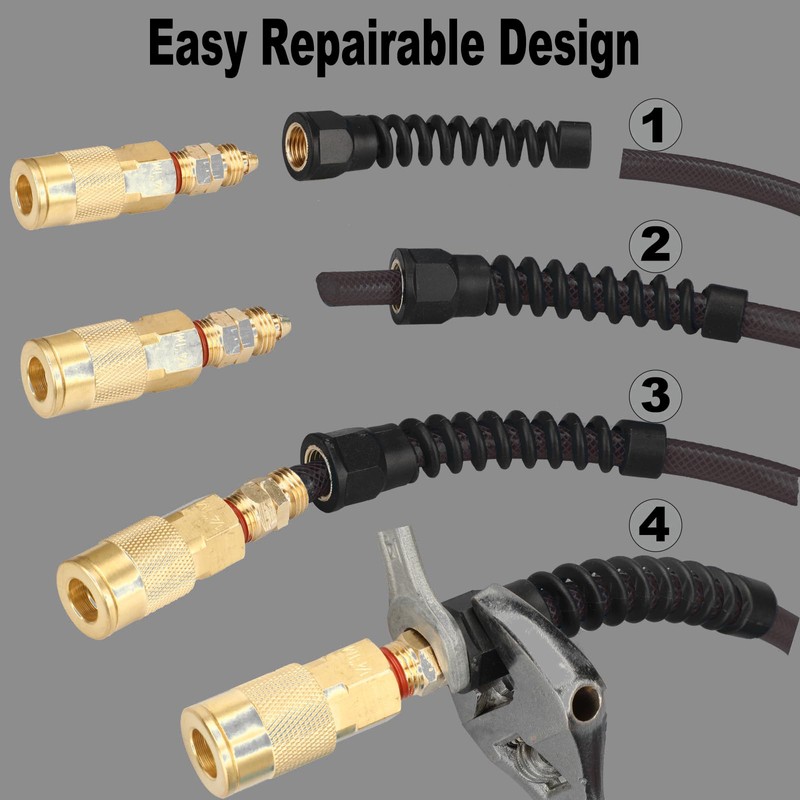 - EASY REPAIRABLE CONNECTIONS: Features solid brass fittings on both ends with sturdy strain relief grips for secure attachment to air tools and compressors. Field repairable hose ends for easy repair without hose clamps.