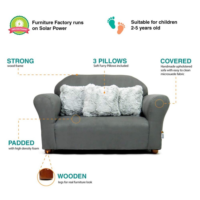 Color:Charcoal/Grey  |  Item Package Quantity:1 Make you Child feel special with this fabulously cozy Plush Keet Sofa with fluffy accent pillows. supremely stable constructed with a frame made of sturdy wood, this comfy sofa covered in supportive foam and a rich micro suede fabric, gives your child the best and most comfortable experience, This sofa is not only perfect for playrooms, little ones' rooms but it will also look great in living rooms and anywhere in your home. It's gorgeous details, including the rounded arms, square back, chic and fluffy accent pillows matching perfectly with this beautiful piece and wood legs for a real furniture look, make this Keet upholstered micro suede sofa a stylish and special furniture piece.