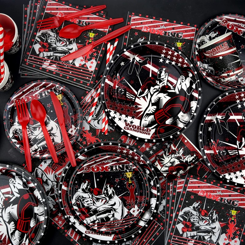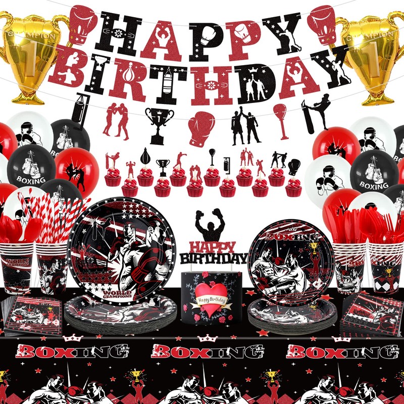 - Boxing Birthday Party Decoration: you will get 1 Happy Birthday Banner, 1 pattern banner, 12 cake toppers, 1 big cake decoration, 2 Champion Foil Balloons, 18 Boxing pattern balloons, 20 large plates, 20 small plates, 20 paper cups, 20 paper towels, 20 straws, 1 Boxing tablecloth, 20 knives, forks, and spoons. Boxing party supplies will decorate your party perfectly