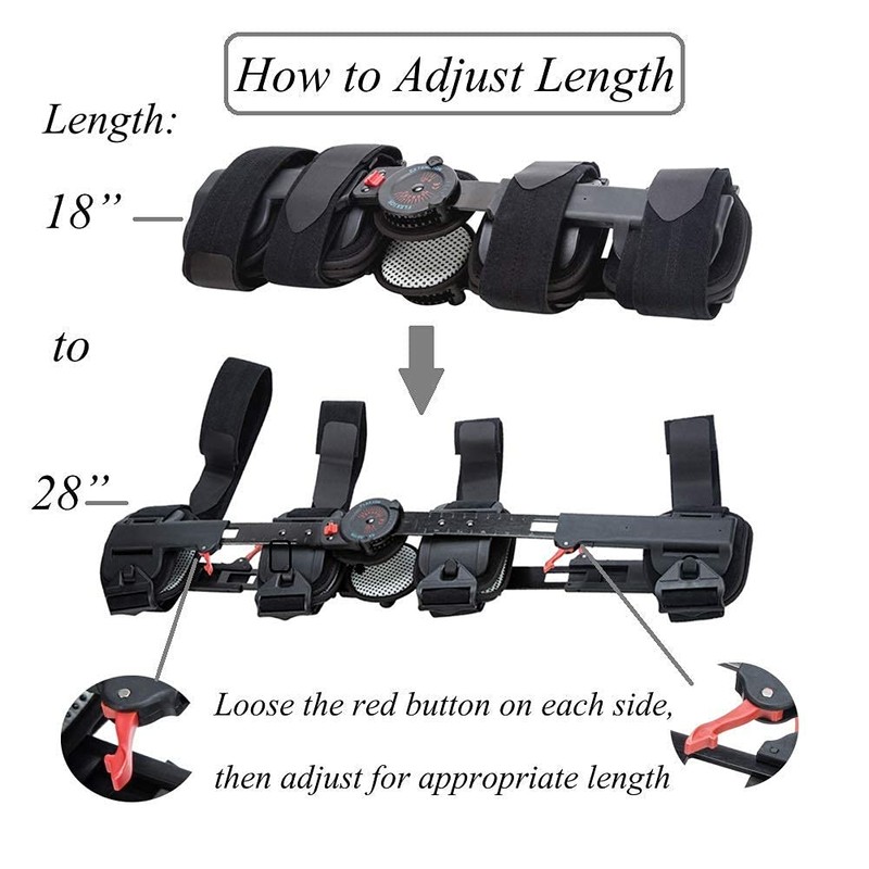 - The adjustable locking dial and extension provide the bilateral range of motion settings, you can adjust the range of motion you need front to back which can be adjusted between -10 to 120 range of flexion and -10 to 30 range of extension, adjustment unit is 10 degrees, to achieve control and limit knee flexion and extension.