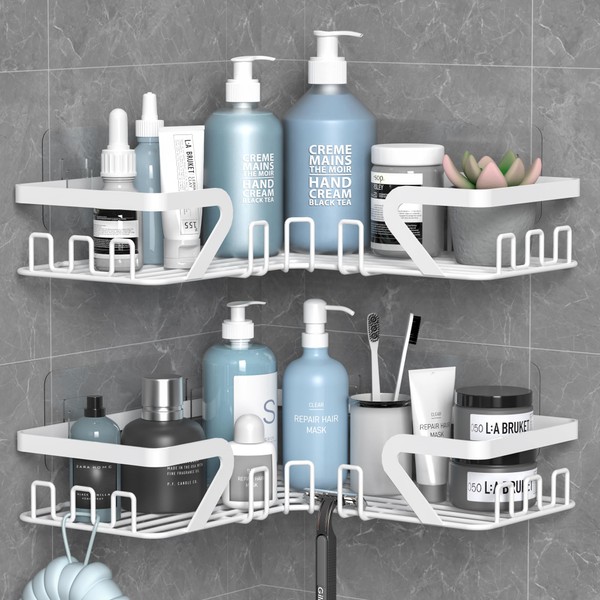 - BATHROOM ORGANISER: This shower shelf no drilling features a clever corner design that saves space in the bathroom and is the perfect addition to any bathroom, neatly storing shower essentials such as shower gels, soaps, bath bombs and razors in easy reach to ensure your tidy showering experience.