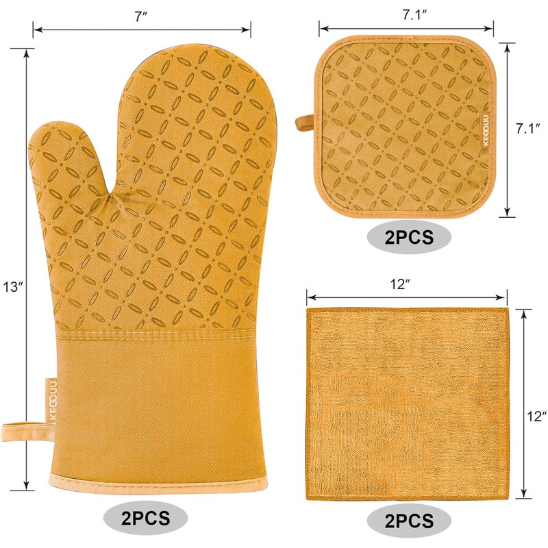 - 6 PIECE KITCHEN ACCESSORY SETS: Our oven mitts and pot holders set including 2pcs non-slip surface silicone kitchen oven gloves (7X13in), 2pcs pot holders (7X7in) and 2 kitchen towels (12x12in), fit for indoor cooking, baking,BBQ or outdoor grilling. Also the oven mitt set is a perfect ideal kitchen gift for women, men, baker, cooker