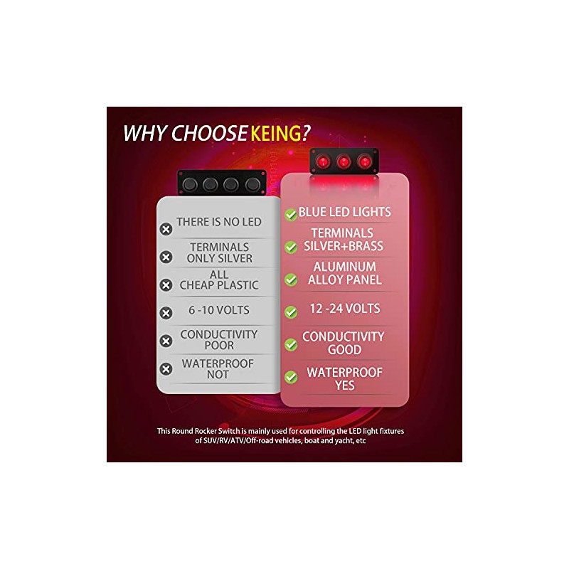 100% BRAND NEW Item ! Never Used !!KEING Guarantee:>>> We take "the customer's satisfaction first" as our principle and offer "FIVE YEARS" warranty on item (s) damaged during delivery or have a confirmed manufacturer defect.>>> Designed for applications where space is at a premium.Technical Specifications: Certifications: CE/ROHS/UL APPROVED Protection level: IP66 Waterproof,Totally Environment Friendly Switch Mode: ON-OFF Expected Lifespan: 100,000 Hours Operating Voltage Range: DC 8V-16V Working Temperature: -45H+175H Product Dimension: 25 x 34 mm/1" x 1.34" ,It is easy to install, just direct setup, if needed,the hole size we recommended you to install is 0.8'/20mm. Material: Made of heavy aluminum panel and anti-retardant materials and superior ABS & PC switches and well-conductive pins 3 Pins Switch: Safety of use, have output circuit protection, overload protection, reverse polarity protection etc.?LED Light Color: Red?Type: SPST (Single pole single throw)?Switch Mode: ON-OFF?High Intensity IP66 Waterproof and Dustproof?Voltage/Amperage rating: 12V 20A DC (6 Amp 250 VAC and 10 Amp 125 VAC)?Suitable for 0.8'/20mm mounting hole Warranty: 5 YearsPackage Include:1x Pre-wired Multi-Functions 3 Gang Switch Panel4x screws
