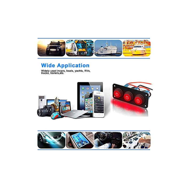 - [Latest styles] - This switch panel includes reverse polarity and automatic short-circuit protection to prevent potential danger, and wires are protected by waterproof rubber-cover and thicker rubber protection ring to prevent rupture. Rocker switch panel with pre-wired wiring harness for you to easily install in both 12V and 24V vehicles, marine boats.