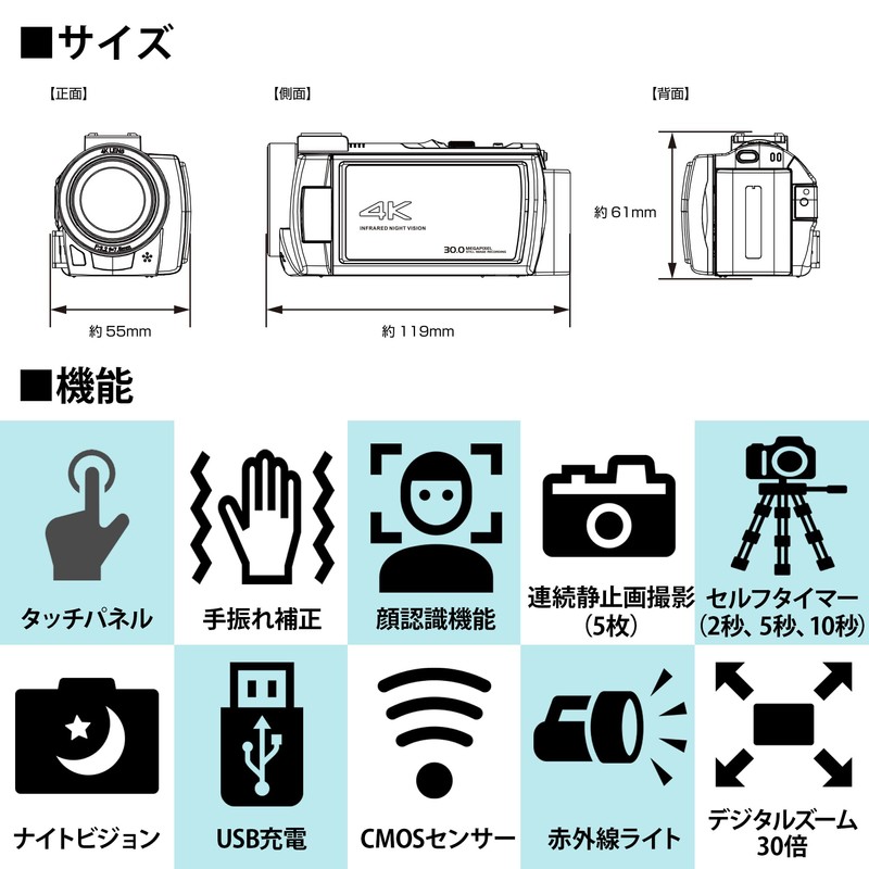- 4K Compact Video Camera: This product is equipped with a high performance CMOS sensor camera made in Japan, and uses a high-performance camera that supports up to 13 million pixels. 4K high resolution video camera *The playback resolution is up to 4K (3840 x 2160) and is about 8 million pixels. *SD card is not included with this product