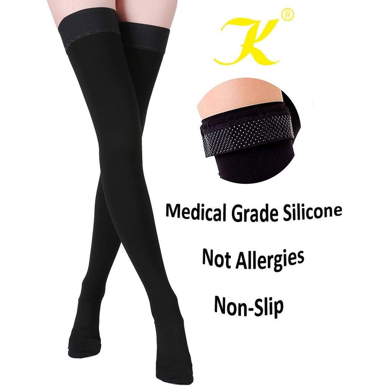 KEKING - Medias de compresión hasta el muslo con puntera cerrada para hombres y mujeres, opacas, 15-20 mmHg, manguera de compresión graduada para piernas con banda de silicona, hinchazón, venas varicosas, edema, DVT, negro, talla M