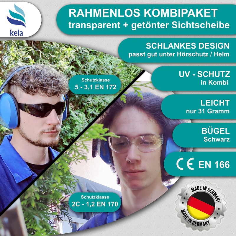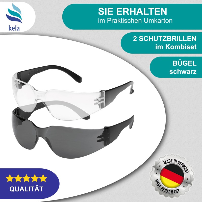 kela Pack of 2 Champion Safety Glasses, 100% Made in Germany, 1 Transparent and 1 Tinted Shatter-Free Scratch-Resistant Work Safety Goggles with Anti-Fog and UV Coating, Sports Glasses