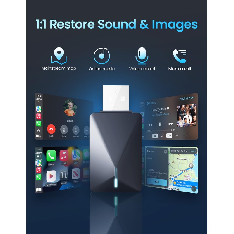 - Compact and fashionable : This wireless apple carplay adopts an upgraded lightweight and fashionable design scheme, reducing the volume by 50%, with a fashionable appearance and convenient portability, which will not take up too much space in the car, and the wireless design keeps the car clean at all times. Our wireless car player includes a USB and USB-C converter, dual port design, so can support both USB and Type-C car port access, suitable for all use scenes.