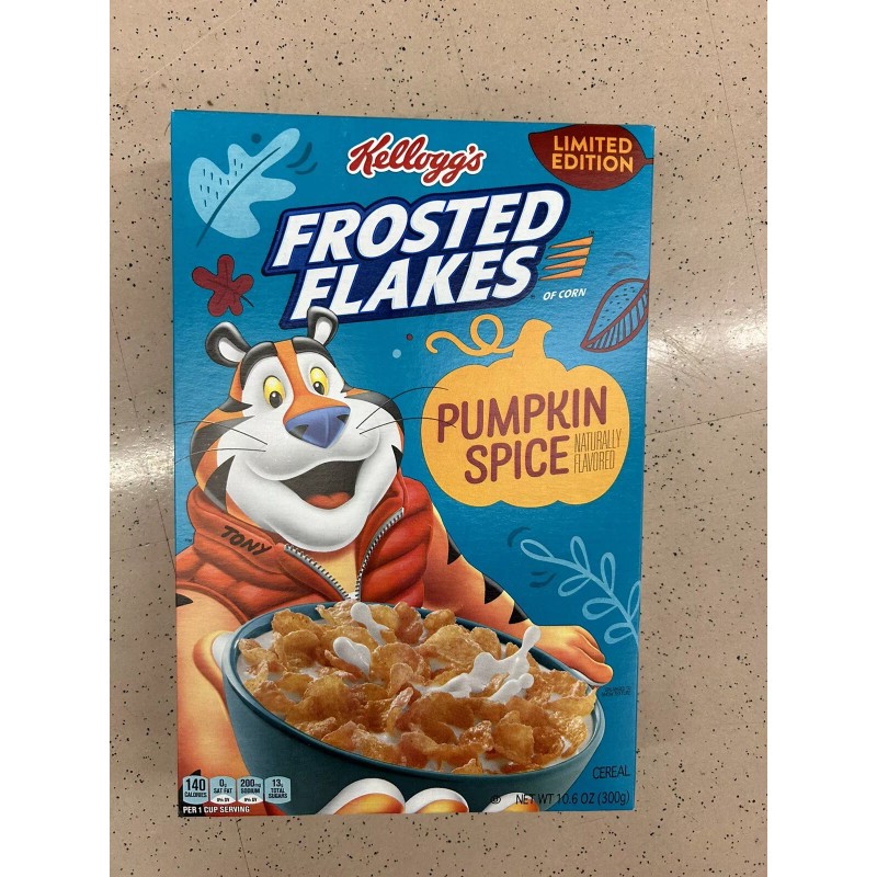 Enjoy the delicious taste of Kellogg's Frosted Flakes Pumpkin Spice Breakfast Cereal. This 10.6 oz box contains two servings of 1 cup each. The cereal flakes are made with a special blend of pumpkin spice that adds a touch of seasonal flavor to your morning meal.