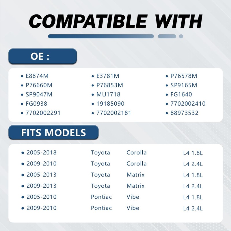 - [Vehicle Fitment]: Compatible with 2005-2018 Toyota Corolla L4 1.8L, 2009-2010 Toyota Corolla L4 2.4L, 2005-2013 Toyota Matrix L4 1.8L, 2009-2013 Toyota Matrix L4 2.4L. Compatible with 2005-2010 Pontiac Vibe L4 1.8L, 2009-2010 Pontiac Vibe L4 2.4L GAS