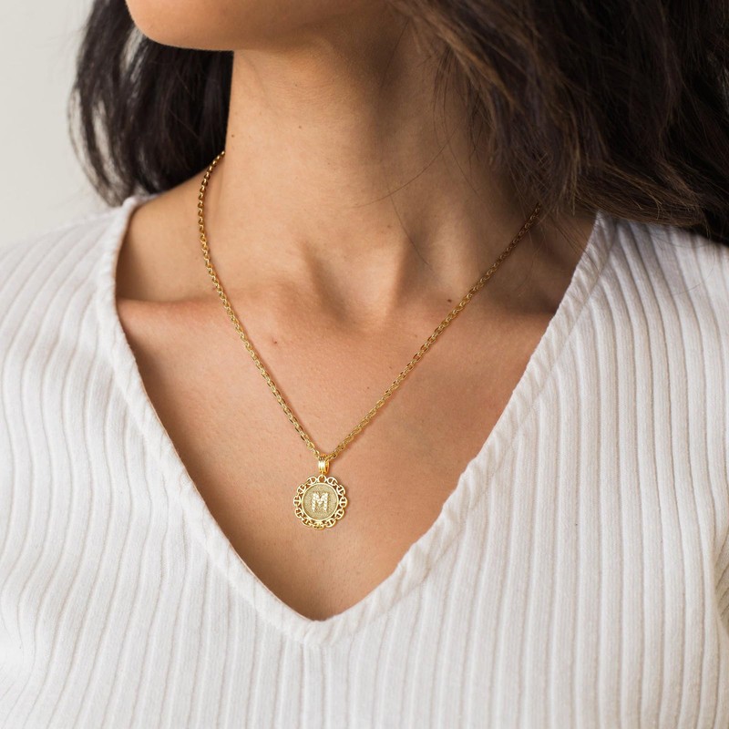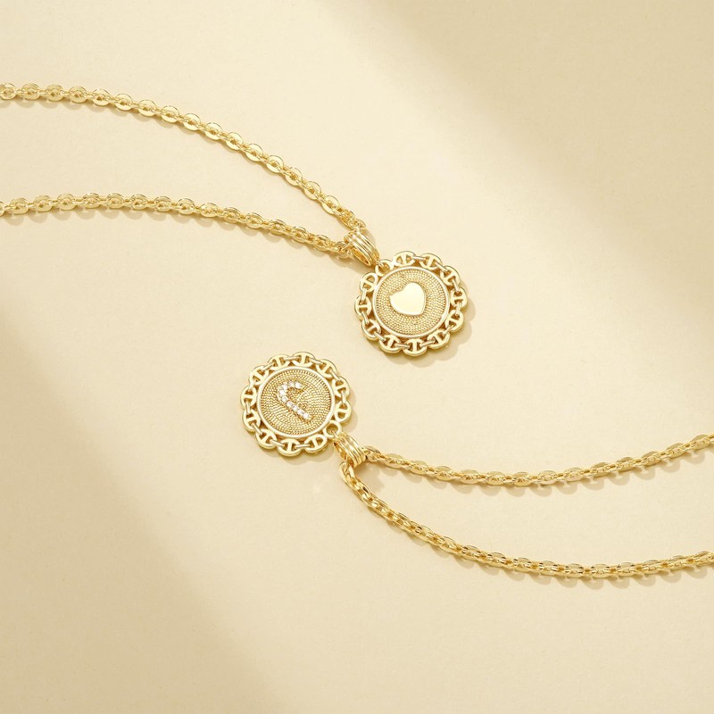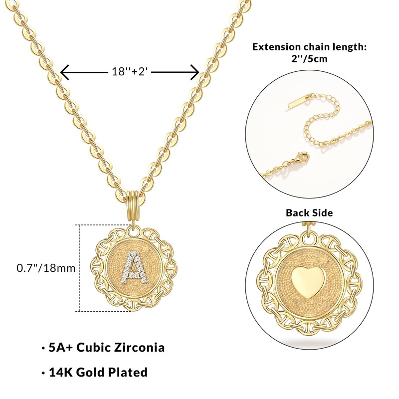 - Gold Initial Necklace: This 14K gold plated round initial necklace is double-sided. One side features a capital letter while the other side has a heart pattern. It allows you to show your personality and is highly personalized fashion necklace
