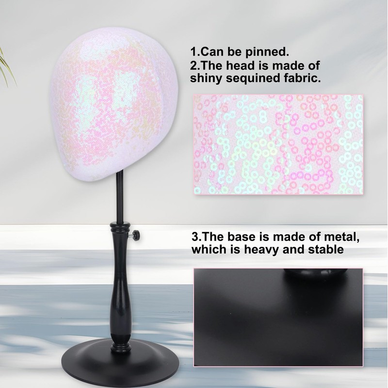 kelukeya Wig Head Adjustable for Hat and Wig Display, Shining sequins Mannequin Head Stand with Retractable Metal Base for Styling and Display (Sparkling white)