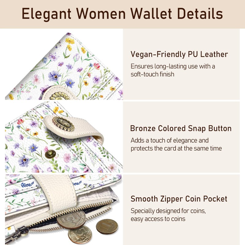 - Vegan PU Leather: Made from scratch-resistant, sustainable PU leather texture, this sturdy women wallet ensures long-lasting use with a soft-touch finish; The bronze colored snap button and reinforced stitching enhance durability, while its lightweight design prioritizes daily convenience for travel, errands, or nights out; This rfid blocking women wallet is an excellent choice for both style and practicality