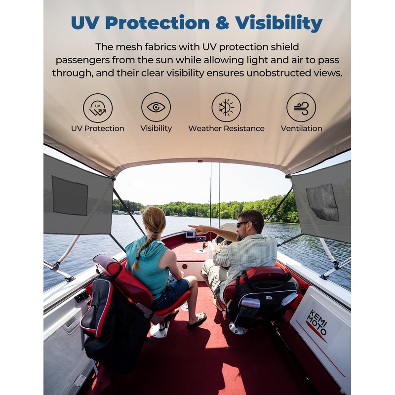 - UV Protection & Visibility: Mesh fabric offers reliable UV protection, effectively shielding passengers from the sun. The unique mesh design allows light to pass through, providing clear visibility without compromising on safety and comfort. Enjoy your time on the water without worrying about sunburns or harsh glare.