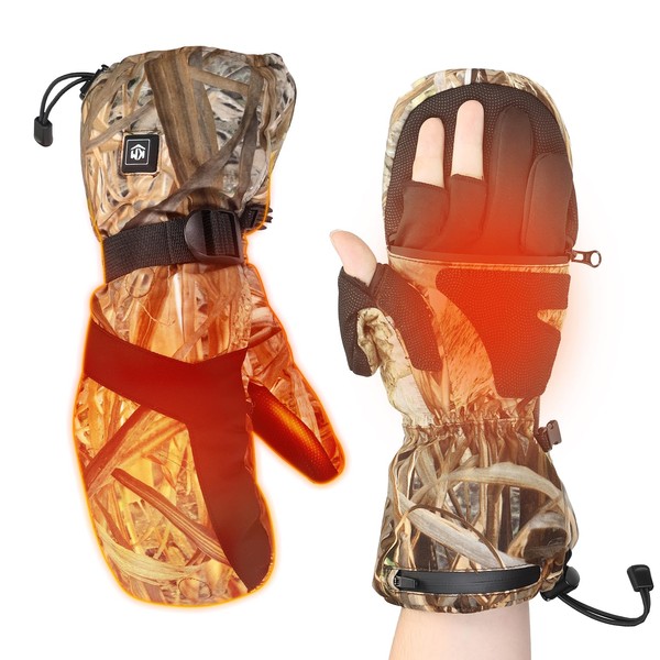 KEMIMOTO Heated Hunting Gloves Camo, Flip Fingerless Mittens for Men Women, Rechargeable Warm Hunting Gloves 3 Heat Settings Max 140°F, Heated Gloves for Hunting Duck Deer Fish, 2 Battery Packs
