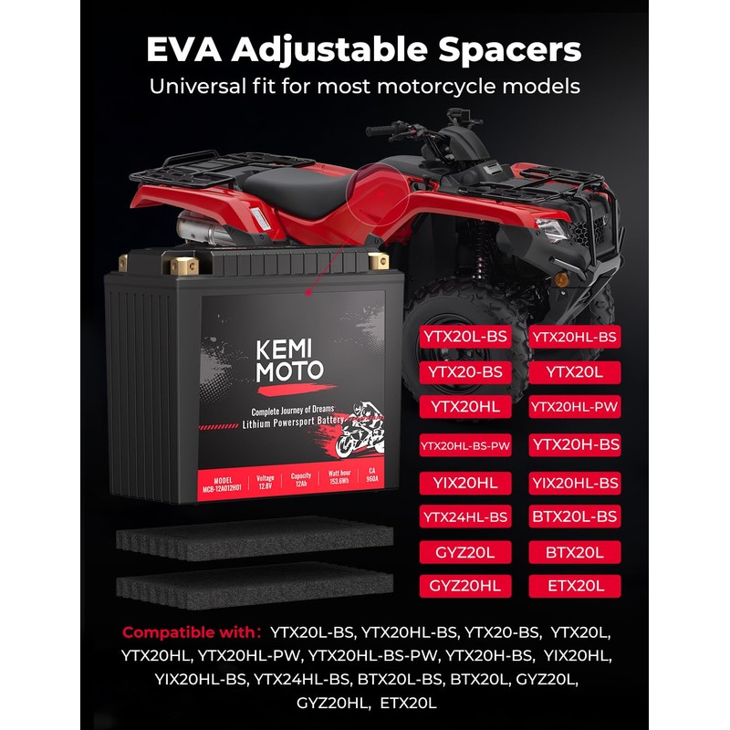 KEMIMOTO Lithium Motorcycle Battery YTX20L-BS/YTX24HL-BS LiFePO4 Lithium Battery 12v 12Ah, Full-Charged Powersports Battery, with 2 Universal-Fit EVA Spacers, Compatible with ATV UTV Motorcycle
