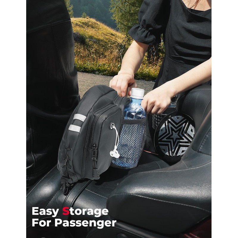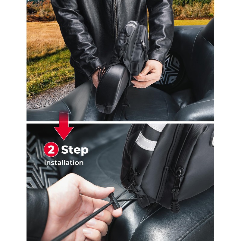 - Premium Waterproof Materials: The rider's backrest bag is made of high-quality PU leather, ensuring durability. The design incorporates small reflective strips on both sides, enhancing safety during night rides. The high-quality surface is not only waterproof but also capable of withstanding harsh weather conditions effortlessly