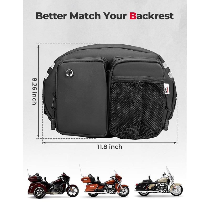 - Wide Compatibility: The KEMIMOTO motorcycle backrest organizing kit is specifically designed for convenient passenger access while riding. The dimensions of the motorcycle backrest bag are 11.80 x 8.26 x 1.65 inches, making it suitable for most motorcycles equipped with a rider backrest. It is compatible with various models including 2009-2022 Touring, CVO Street Glide, CVO Road Glide Limited, Tri Glide, Softail, Dyna, and Sportster models