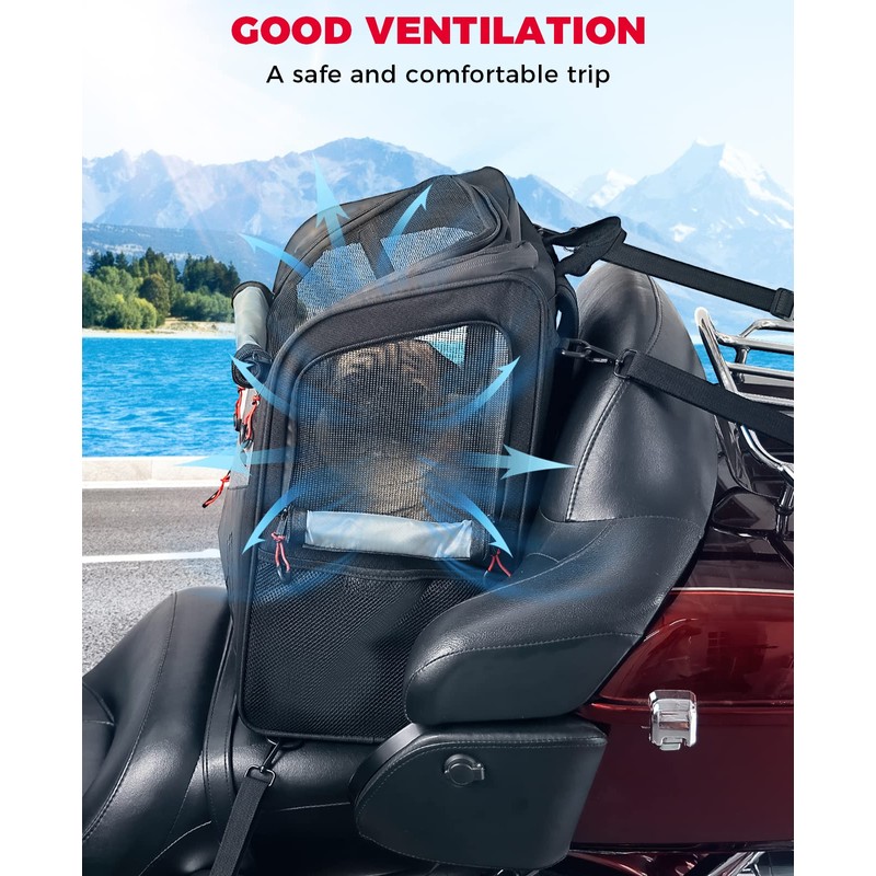 - Breathable Design and Keep Shape: Motorcycle pet carrier with 3 meshes breathable panels and access flaps let your lovely guys enjoy the fresh air and riding trip in a safe pet palace. The internal metal frame and a nice rigid base can protect your buddy well and make a good look on your bike at the same