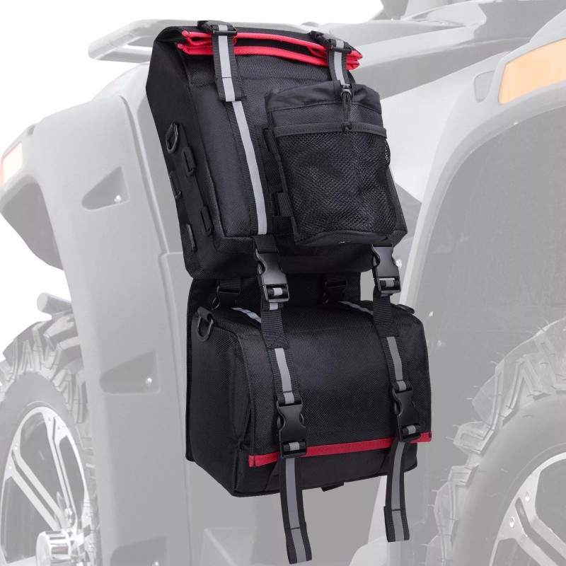 Description: Feature: 1.Upgraded Material This ATV fender bag is made of 1680D water-resistant cloth, which is scratch-resistant and wear-resistant; moreover, the coating inside enhances the water-resistant ability of the bag, so splashed muddy is not easy to penetrate into the bag; the foam cushion can absorb shock to protect the contents of the bag. 2.Large Storage Space The upper bag can storage gloves, cameras and other items, and the elastic straps in it can fix glasses, keys, tools, etc.; the detachable lower bag with aluminum foil can keep your food cool in summer and keep them warm in winter for 6-8 hours; no-zipper design can maximally open the bag, and then you can get items easier and faster. 3.Water Holder The water holder with aluminum foil can keep your drink cool in summer and keep them warm in winter for 6-8 hours. It can be installed on both sides of the bag according to your needs; the bottom of the water holder has round holes for draining. 4.Safety Escort at Night Reflective Strips for driving safer in inclement weather, it can help others notice the objects in poor light conditions when illuminated by a light source. 5.Easy installation No need to use any tools. Two quick release straps on the upper and lower ends of the bag can tie it to the shelf of the ATV; use self-fastening straps on the back of bag can make the bag fixed ATV firmly.