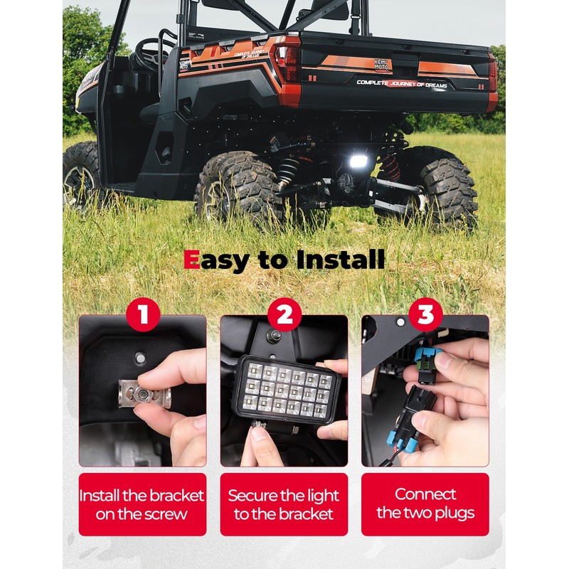 - 【Easy to Install】The backup light can be installed on XP 1000 without drilling holes and is plug-and-play. For UTV other than XP 1000, a spacer needs to be prepared and holes need to be drilled on the spacer before installing the bracket (UTV with a muffler is also the same).
