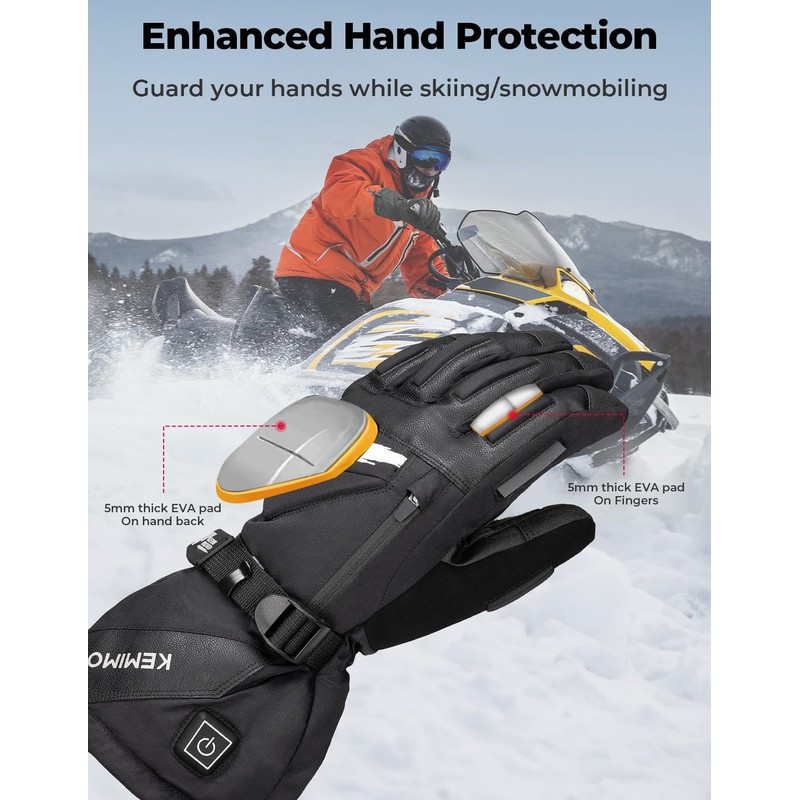 KEMIMOTO Waterproof EVA-Pad Heated Gloves for Women with Battery, PU Leather Snow Gloves for Men, Touchscreen Snowmobile Gloves, Heated Ski Gloves, Snowboarding Gloves, Electric Glove for Cold Weather
