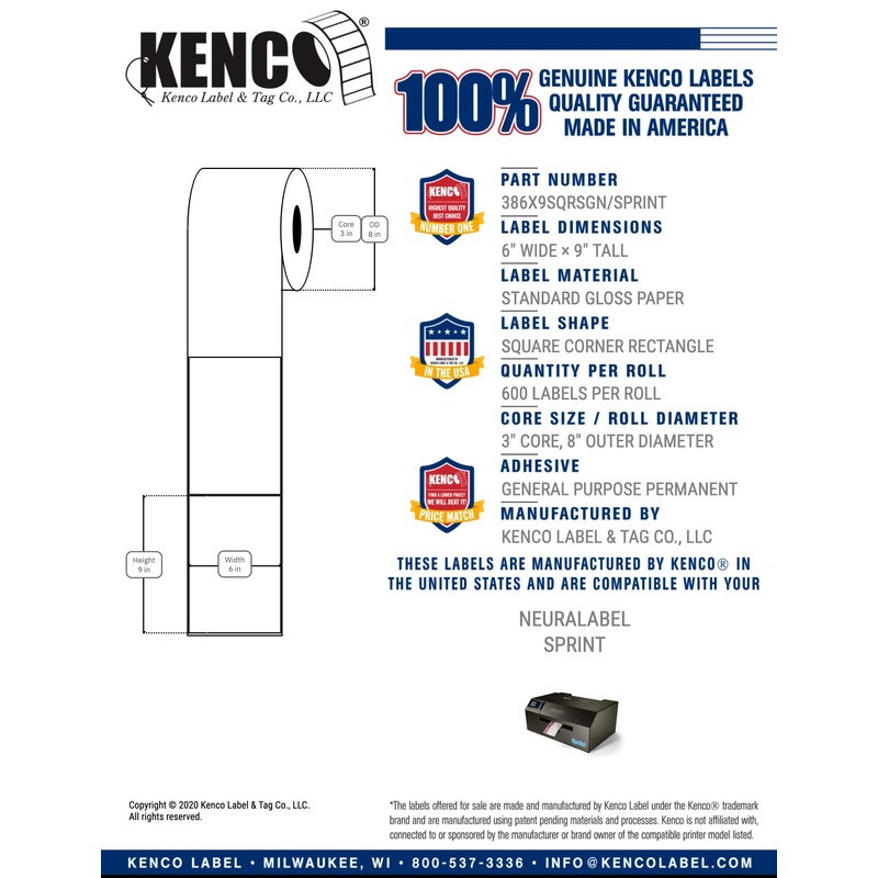 Kenco Premium 6" X 9" Standard Gloss Paper Roll-Fed Inkjet Labels. Compatible with NeuraLabel Sprint Printers. 600 Labels per Roll on a 3" Core and 8" Outer Diameter.