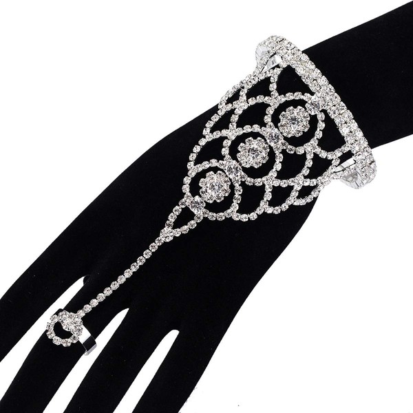 Kenjudess Sparkling Rhinestone Slave Bracelet with Finger Ring Bridal Luxury Crystal Harness Bangle Chain Wedding Prom Hand Accessories for Women (E)