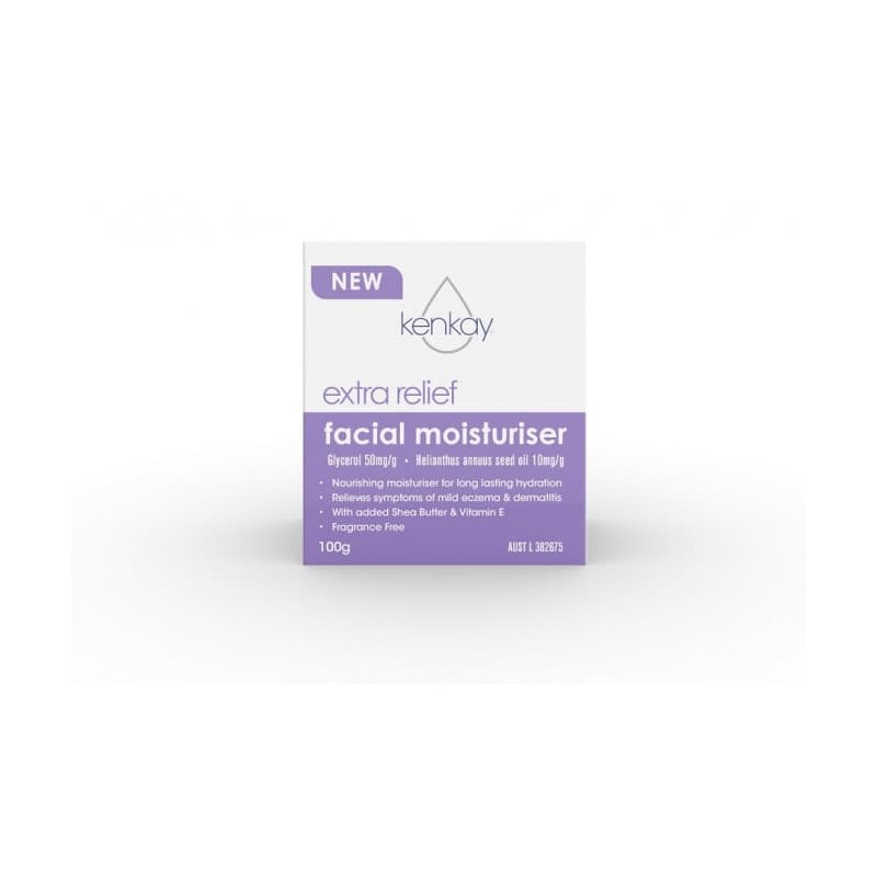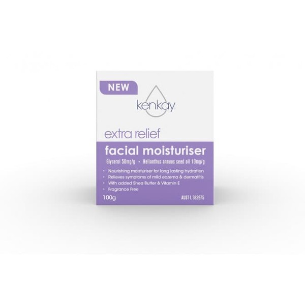 NEW KENKAY Facial Moisturiser relieves the symptoms of mild eczema and dermatitis and is suitable for dry and sensitive skin. Specially formulated with Sunflower Oil, it calms skin irritation and restores the skin’s barrier. Added Vitamin E enhances skin elasticity and Shea Butter will soothe as it melts into your skin.