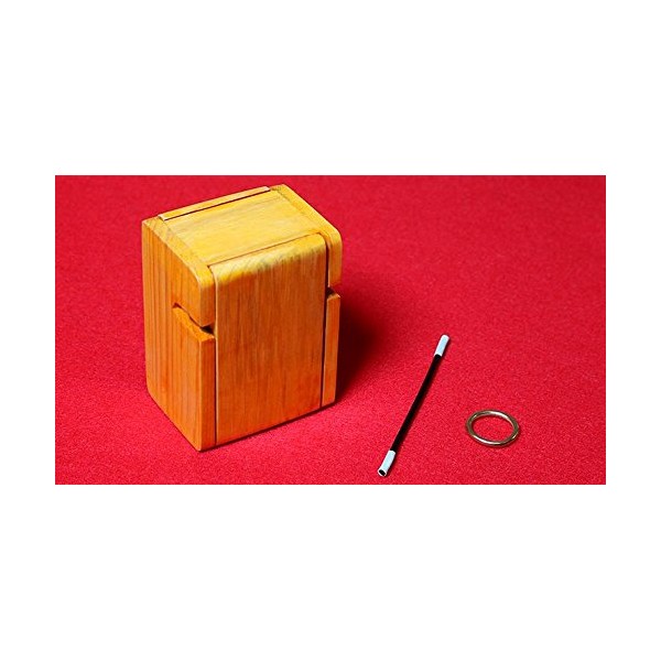 A brass ring is placed on the floor of a small wooden box. The front and back doors of the box are closed. A mini magic wand is placed in the slotted holes existing on the side walls of the box with the ends of the wand protruding outside the box. The performer makes magical passes around the box, then takes out the wand and there comes the surprise. The ring is found to be trapped on the wand! Both doors of the box are open thus showing clearly that there isn't a duplicate ring.