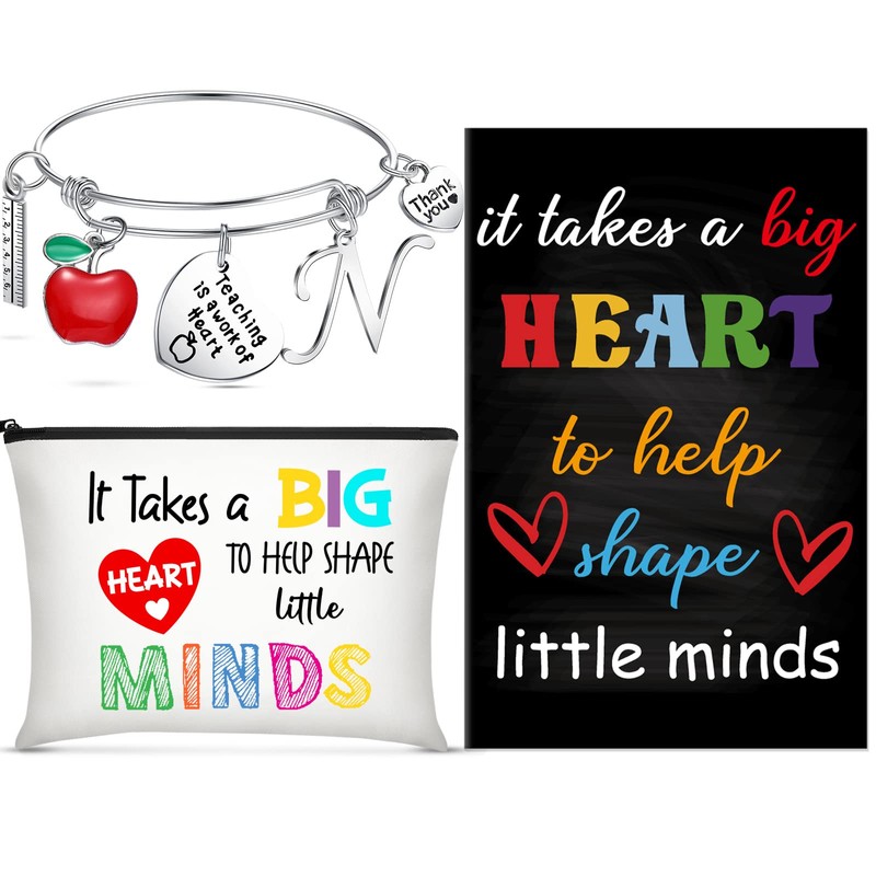 Kenning 3 Pcs Teacher Appreciation Week Gifts Set Include Inspirational Notebook with Quote, Zippered Makeup Bag and Bracelet with Initial for Teacher Week, Birthday, Back to School(Letter N)