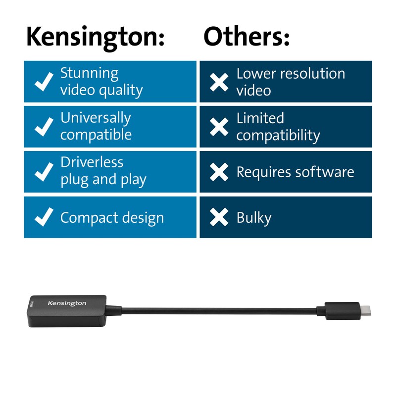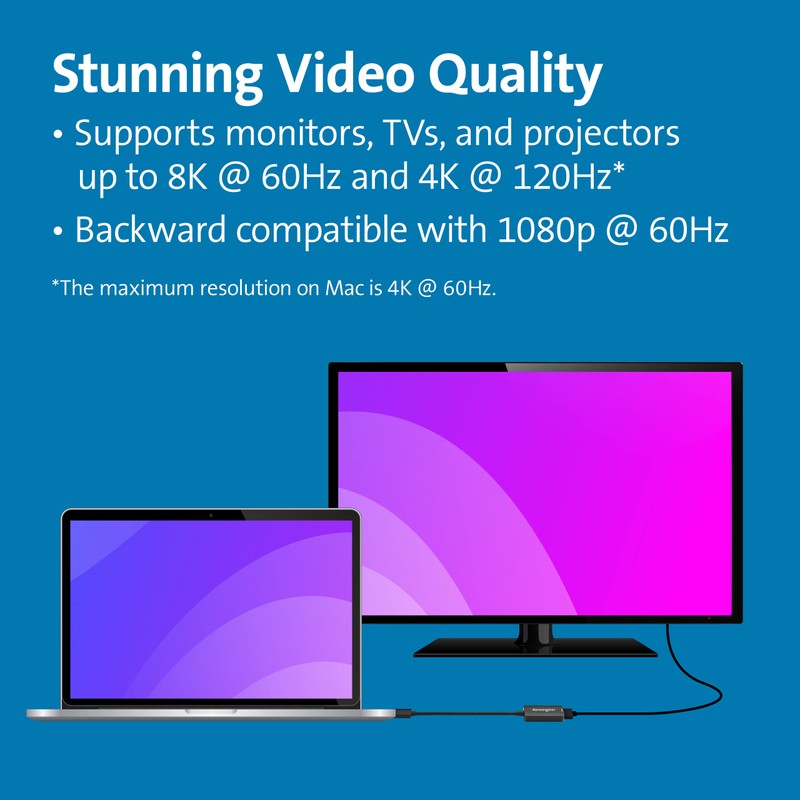 - Stunning Video Quality USB-C to HDMI Adapter: Get the most from any HDMI-enabled display with the Kensington USB-C adapter, 8K @ 60Hz, 4K @ 120Hz, to easily add an additional HDMI display to your setup