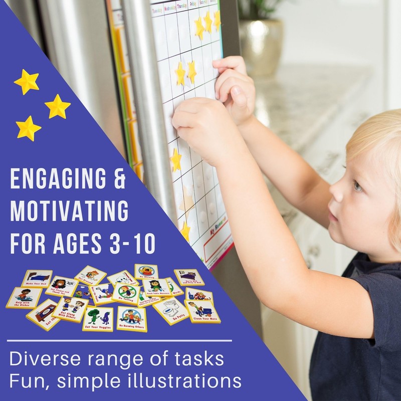 - PERFECT ANYWHERE IN YOUR HOME: It has strong magnetic strips to hold it securely to any metal surface, like your refrigerator. It includes two hang tabs as well, so it can be hung almost anywhere. The sturdy plastic stars and chores attach easily with hook and loop fasteners, so they stay in place, making it a reliable and secure teaching method.