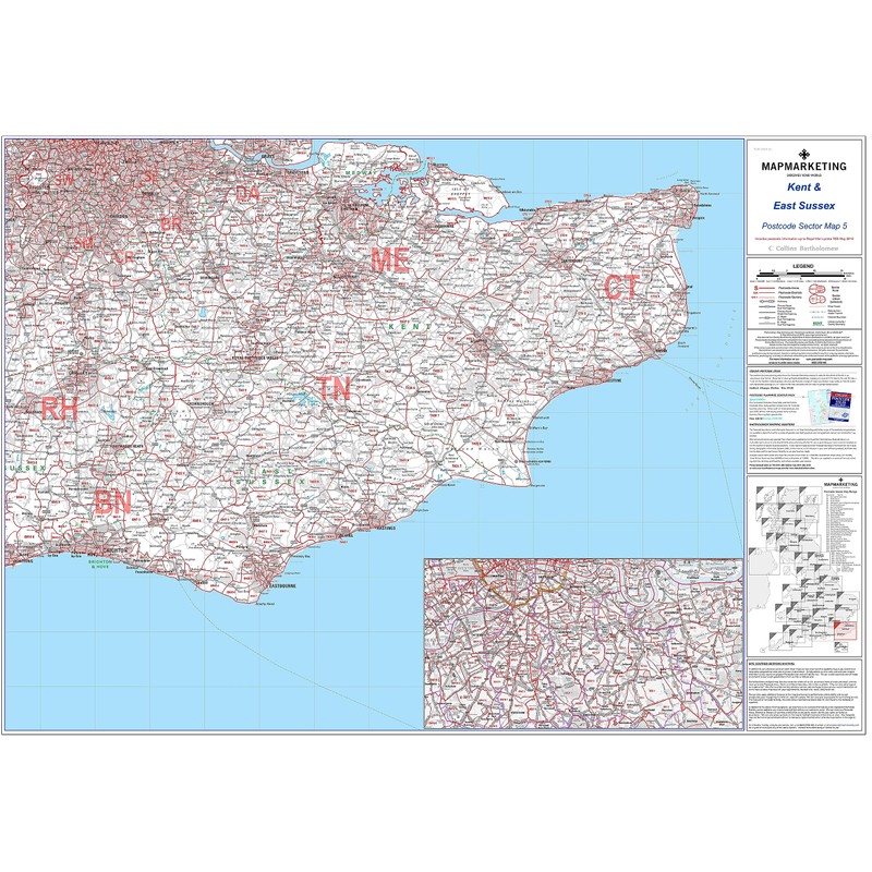 Kent And East Sussex Postcode Sector Wall Map- Postcode Sector Map 5 - Laminated Wall Map With Motorway, A' Roads, B' Roads, City Plans, Area, District, Sectors
