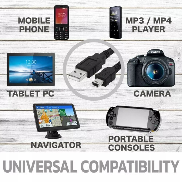 This USB 2.0 tyep A-male to mini B 5 pin-male Cables are typically used on USB device with USB 4pin plug such as MP3, MP4, Card Reader digital camera, cellphone, PDA and many other device that has USB mini 4 pin to the PC computer or Mac. USB 2.0 Specification Compliant. Fully compatible with PC and Mac. Supports Plug and Play HotPluggable specification Fast 480 Mbps transmission speed. Backward compatible with USB 1.0, 1.1. Exceeds all USB specifications. Black Color. AWG: 28 AWG. Standards: UL, CSA, ISO 9001:2000 manufacturer.